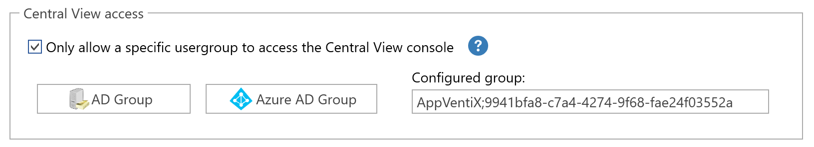 Administrative access to AppVentiX can be limited to a selected group of administrators. In the Central View settings, you can configure an Active Directory or Entra ID (Azure AD) group to allow console access. If a user is not in this group, it’s impossible to start the console.