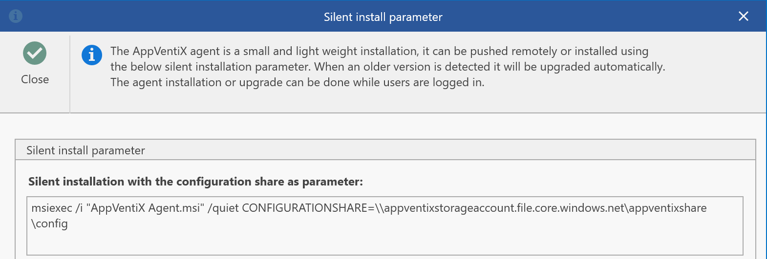 The lightweight AppVentiX agent can be pushed from the AppVentiX management console but also be incorporated in your deployment system. The silent installation parameters can now be retrieved from the console, which makes it easy to include in your preferred image deployment solution or pipeline.