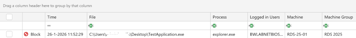 Each block event is centrally recorded for auditing and analysis. Administrators can review the event and directly create an allow policy from it. After a Workspace Refresh, the updated rule is applied immediately, enabling the application or process to run.