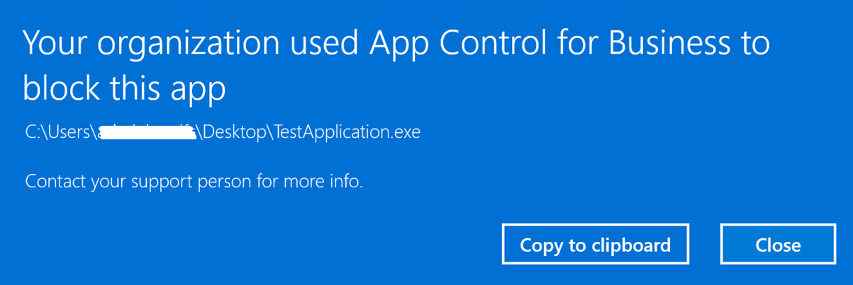 After configuring App Control in learning mode, the machine group can be switched to Enforced Mode. When a user attempts to launch an unauthorized application or process, the following notification is displayed: