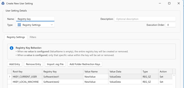 Registry keys can easily be managed, both user and machine registry keys are supported: