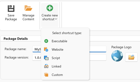 Simply create a new package and select “Create new shortcut” to configure the target. Shortcuts can start executables with or without arguments, whether they are included inside the package or located externally on the system.