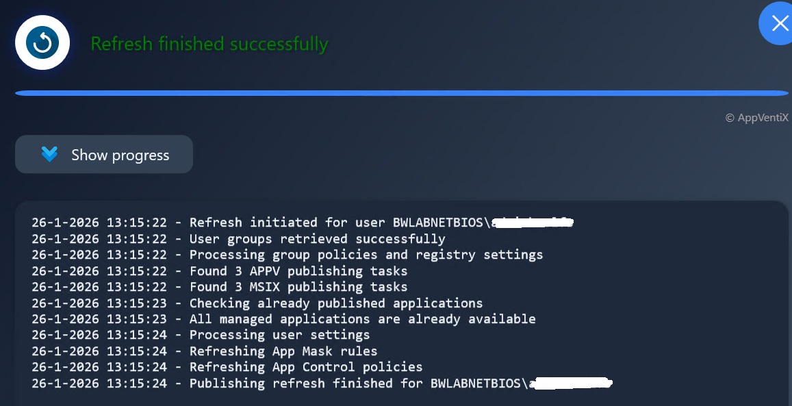 End users can quickly refresh their workspace and applications at any time using the new Workspace Refresh shortcut in the Start Menu, allowing changes to be applied instantly without logging off or rebooting.