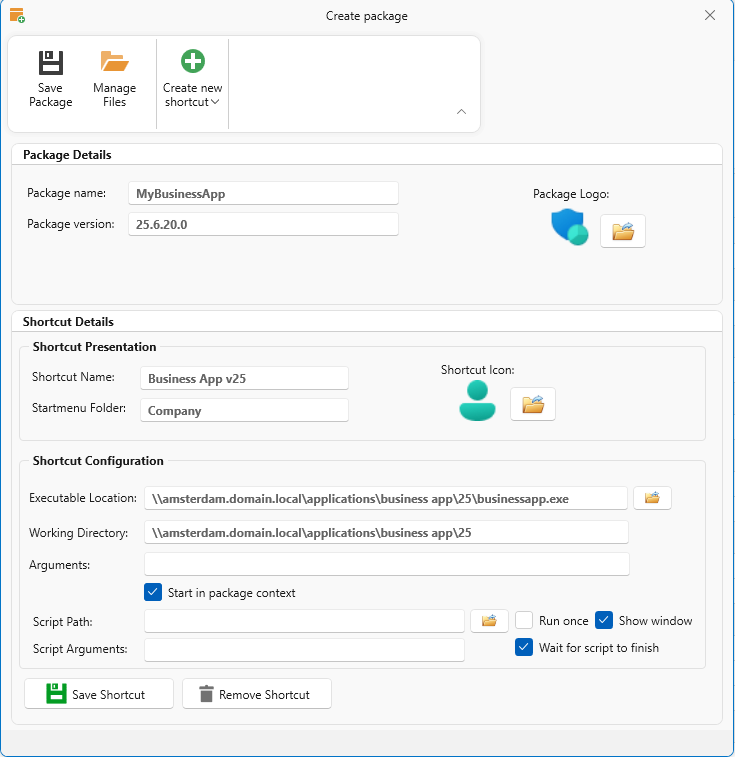 1.5 Provide the details of the shortcut such as the name and start menu location, executable, working directory, arguments, etc. and click on Save Shortcut