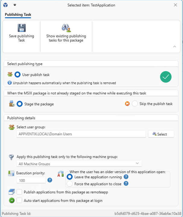 Select the newly created package and click on Deploy to create a new publishing task. In this example we’ll deploy to the Domain Users and All Machine Groups. We’ll leave Auto start disabled. Click on Save publishing task.