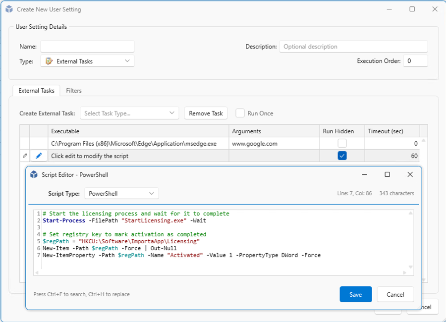 External Tasks in AppVentiX unlock powerful automation by allowing administrators to execute processes, PowerShell scripts, CMD scripts, or inline scripts directly as part of application delivery and management workflows. This capability enables precise control over pre- and post-actions – such as preparing the environment, applying configurations, validating prerequisites, or performing cleanup – without manual intervention. By embedding automation into everyday operations, AppVentiX helps teams reduce errors, improve consistency, and accelerate deployment cycles.